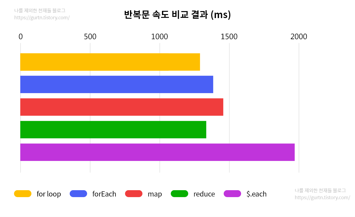 브라우저에 따라 다른 기준이 나오겠지만, 크롬을 기준으로 [ for loop > reduce > foreach > map >>> $.each ]의 순으로 속도가 더 빠른 거 같습니다만.... 결국은 제대로 된 용도에 적절한 for loop, 고차함수를 사용이 중요한 것 같습니다.